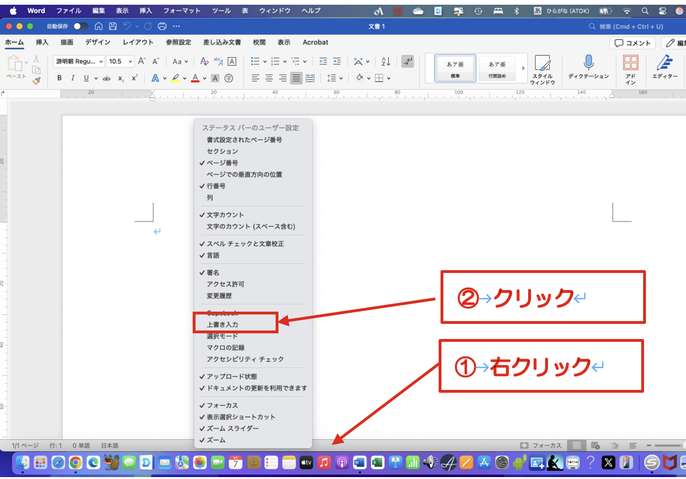 Mac版Wordでも同様に、ステータスバーを右クリックして「上書き入力」の表示ができます。