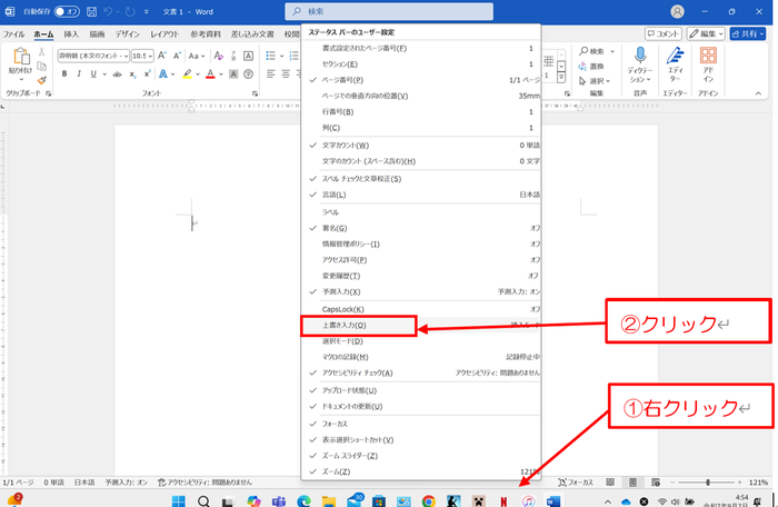 ステータスバー:Word下部を右クリックして「上書き入力」を表示すれば、現在の状態が一目でわかります。